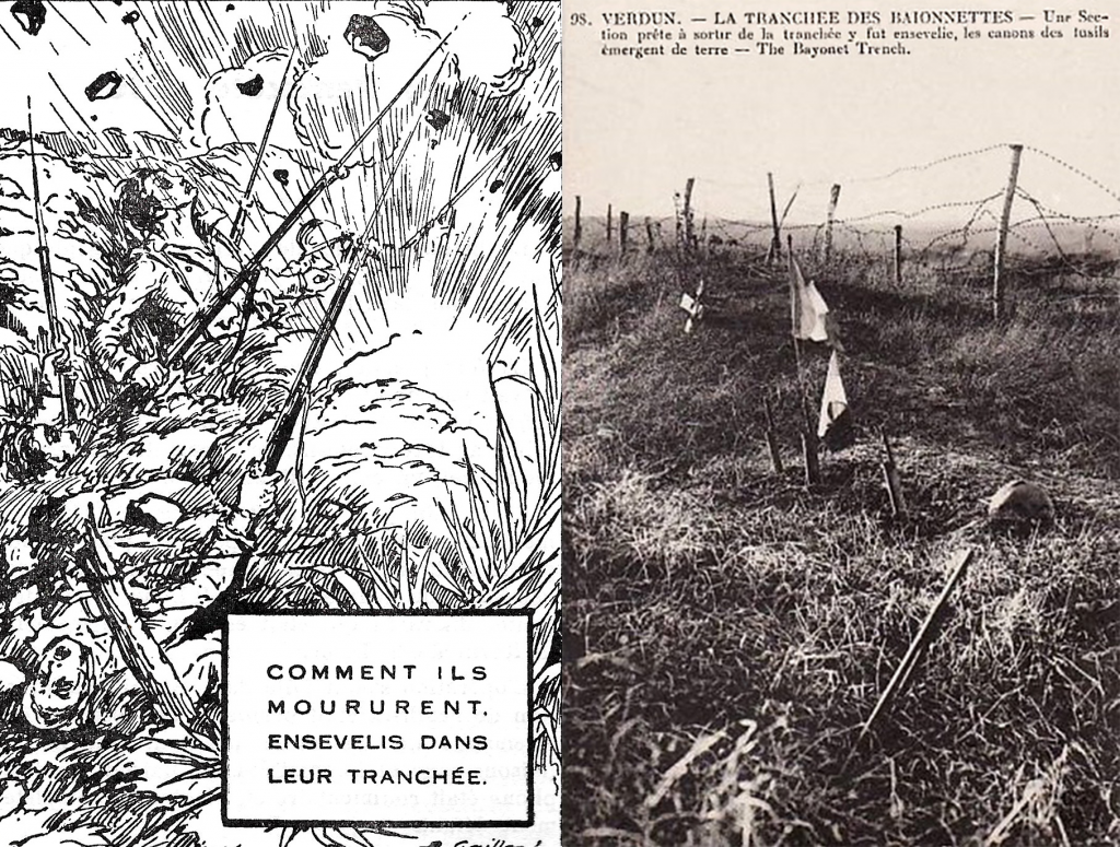 Dessin : la légende de la tranchée des baïonnettes et la photo prise après-guerre