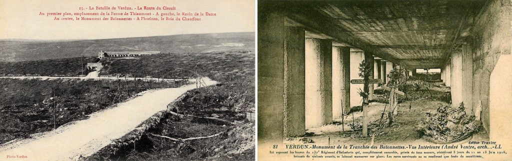 La tranchée des baïonnettes peut être considérée comme appartenant à cette catégorie. Pendant deux jours, des hommes vont effectivement disparaître complétement happés et broyés par les explosions, engloutis dans les trous d’obus existants qui forment, lorsqu’ils se rejoignent, des semblants de tranchées. Pendant deux jours, le sous-lieutenant Lucien Polimann (voir biographie), prêtre d’origine meusienne, devenu commandant de compagnie du 137ème RI, combat dans ces conditions avant d’être fait prisonnier.