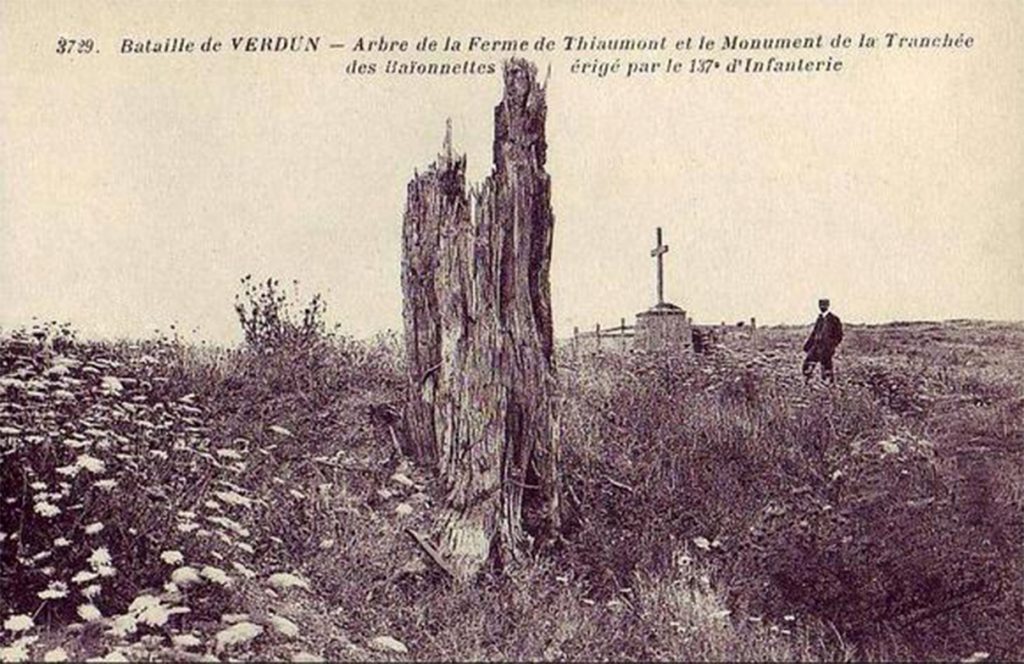 Carte postale après-guerre : reste d’arbre de la ferme de Thiaumont détruite et le 1er monument du 137ème RI
