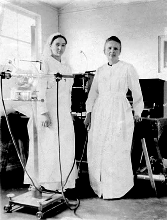 Irène et Marie Curie dans un hôpital à l’arrière du front