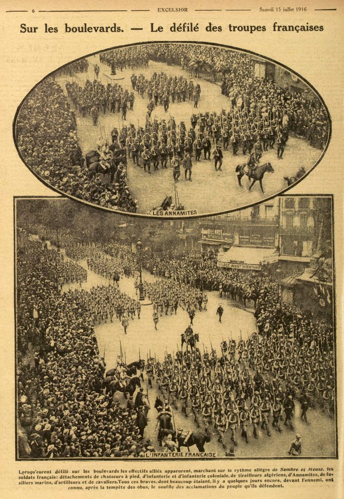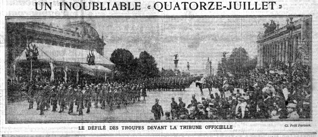 Un an, auparavant, la fête nationale avait été marquée par le transfert des cendres de Rouget de Lisle aux Invalides. 1916 va être l’occasion de mettre en place une tradition qui va perdurer jusqu’à nos jours avec quelques aménagements : le défilé militaire. Pour la première fois, des troupes françaises et alliées vont parader dans les rues de Paris. Elles ne vont pas descendre les Champs-Élysées, à proprement parler. Les unités vont d’abord se rassembler sur l’Esplanade des Invalides, pour une revue passée par le Président de la République, avant de défiler devant le Grand Palais, la place de la Concorde, la rue Royale, les grands boulevards puis de se disloquer place de la République.