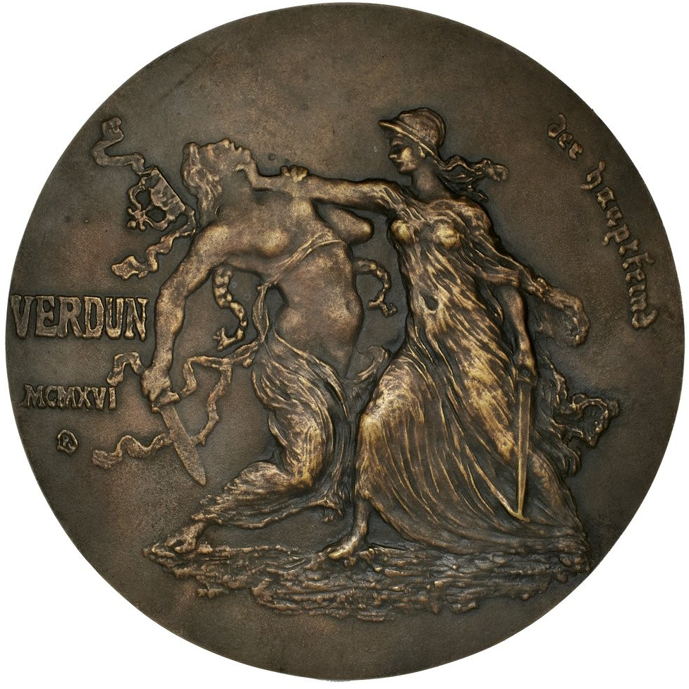 Médaille de 1916 de Pierre Roche, Verdun : Marianne au casque de poilu en train de vaincre l’allégorie impériale (BNF)