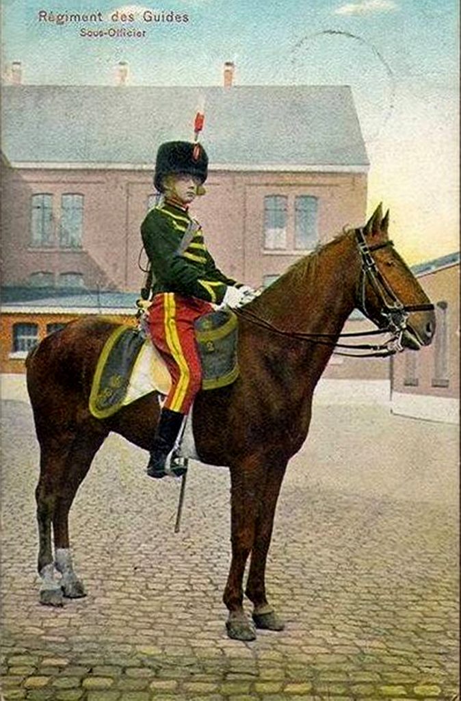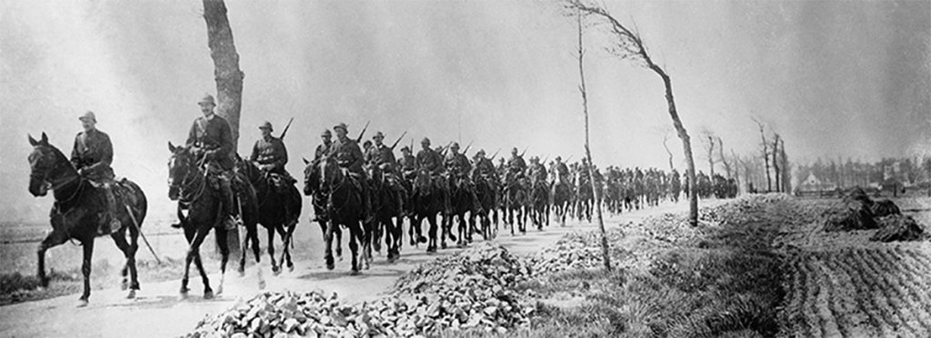 Derrière l’infanterie se trouve la cavalerie, plus précisément une unité de Guides. Après 4 années de guerre de position, ils ont abandonné leurs tenues panachées du début de la guerre, digne des guerres napoléoniennes, pour adopter l’uniforme beige et le casque Adrian.