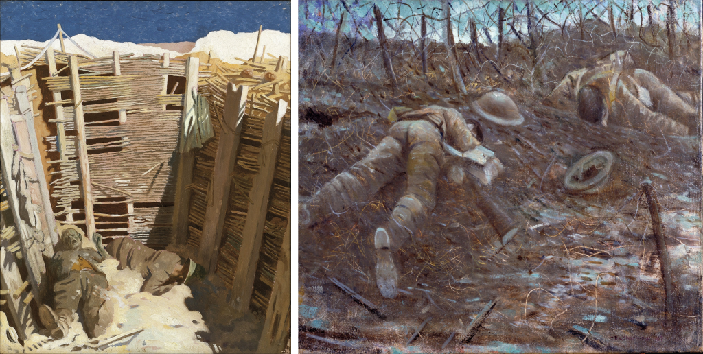 Tableaux de William Orpen (à gauche) « Dead Germans in a trench » et de Christopher Nevinson’s (à droite) « Paths of Glory »