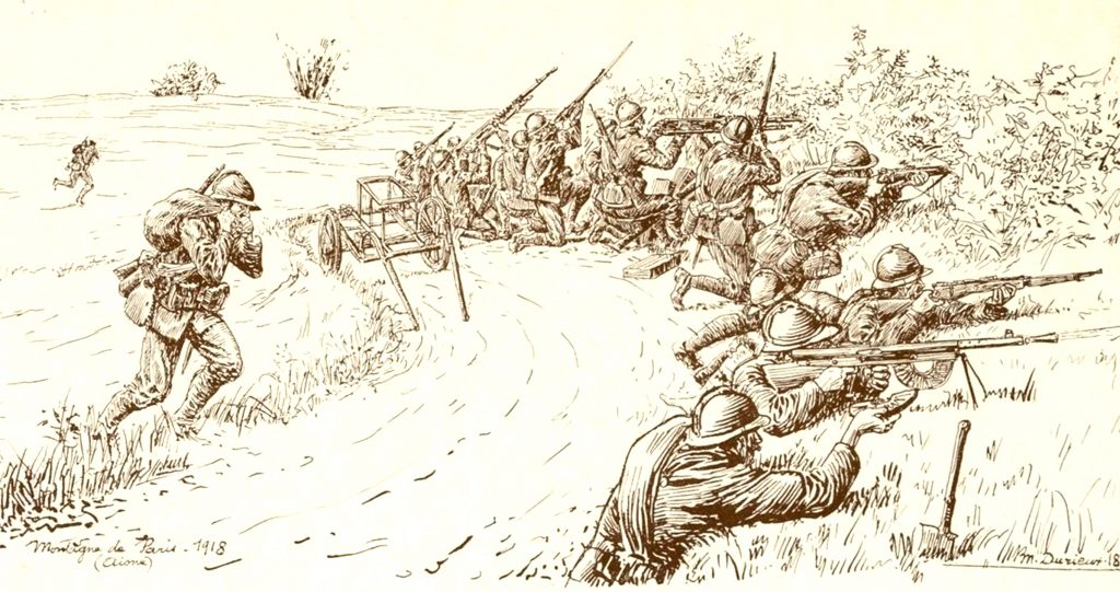 Dessin (Durieux, mai 18) : Le Régiment de Marche de Paris défendant la Montagne de Paris au sud-ouest de Soissons