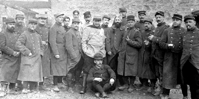 Photo : Louis Pergaud et ses hommes, extrait du film : réplique du petit Gibus tirée de L’os à moelle n°6 (1939) qui aurait pu s’appliquer à ce jour de la guerre de son « père »