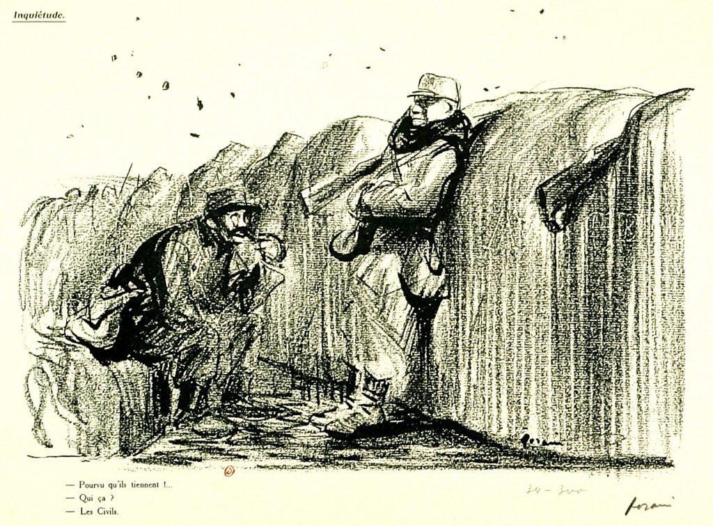 Bref, le dessin de Forain capte parfaitement l’air du temps. Le questionnement du pays était : « Pourvu qu’ils tiennent ! », ce qu’il détourne ironiquement dans la bouche d’un Poilu.