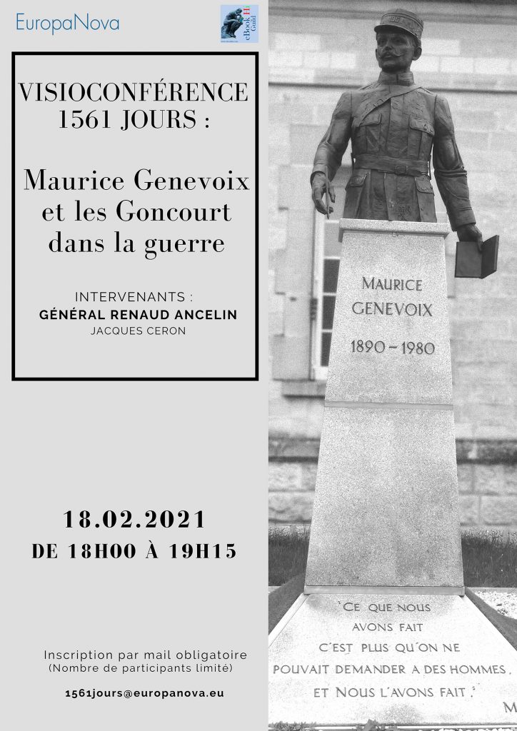 Après le succès de la vidéo-conférence du Général Ancelin de janvier, celle-ci sera redonnée le 18 février 2021 de 18h00 à 19h15. Les équipes d’EuropaNova et de la Guilde, l’éditeur de 1561 jours, sont heureuses de vous inviter à cette conférence qui a pour thème : Maurice Genevoix et les Goncourt dans la guerre